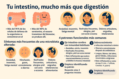 En mi práctica clínica he visto cómo el desequilibrio de la microbiota —disbiosis— contribuye a ansiedad, fatiga, síndrome de intestino irritable, alergias, acné y digestiones dolorosas.